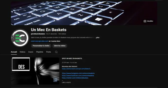 Et bien c'est tout d'abord les deux chaînes Youtube toujours intitulé Un Mec En Baskets car j'ai toujours besoin de ce défouloir. Cela inclut donc la chaîne conernant les Tutoriels et la chaîne concernant les programmes informatiques.